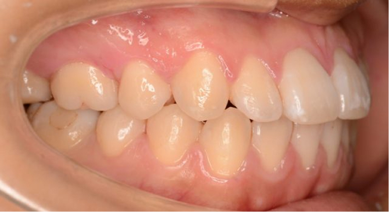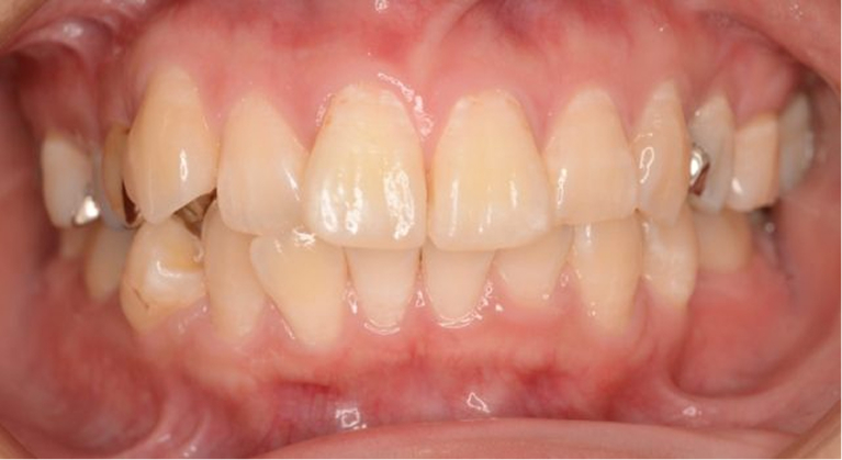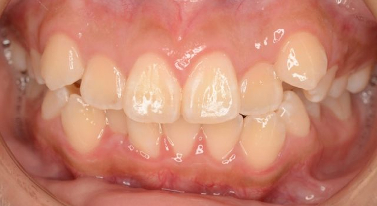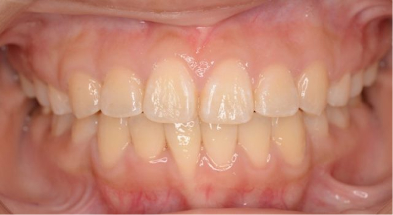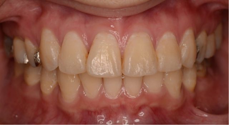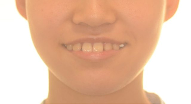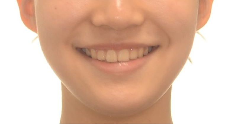 - 前歯部のかみ合わせが著しく深く(過蓋咬合)、上顎側切歯・左側犬歯が小さい(矮小歯)状態でした。上顎の歯を抜歯した上で、前歯の垂直的改善だけでなく、前後的かみ合わせも改善しました。
