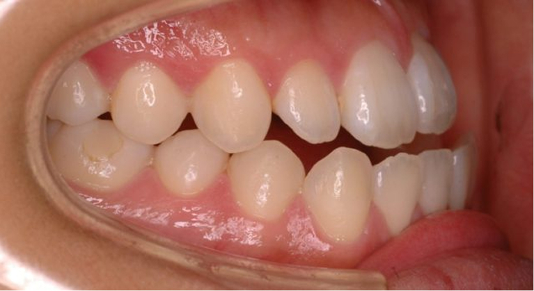 - 前歯のかみ合わせが深く、咬んだ時に下顎の歯が見えない。上顎の前歯が小さい。